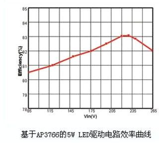 圖2為該方案的5W應用電路樣機實物照片。圖3是基于AP3766的5W LED驅(qū)動裝置實物照片。圖4為基于AP3766的5W LED驅(qū)動電路滿載效率隨交流輸入電壓變化曲線。圖5為基于AP3766的5W LED驅(qū)動電路滿載輸出IV特性曲線。