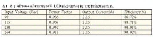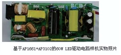 AP1661是一款工作于臨界導通模式下的有源功率因數(shù)校正控制芯片,可廣泛應用于開關(guān)電源、LED驅(qū)動和電子鎮(zhèn)流器的預調(diào)整變換器控制。該芯 片內(nèi)部包括1個啟動定時器可滿足待機應用要求,1個能實現(xiàn)接近于1的功率因數(shù)的單象限乘法器和1個零電流檢測模塊確保臨界斷續(xù)方式工作。AP1661的圖 騰柱驅(qū)動輸出能夠為外部MOSFET或IGBT提供最大600mA驅(qū)動電流和800mA關(guān)斷電流能力。采用了先進的雙極型互補金屬氧化物半導體設(shè)計和制造 工藝,具有低啟動電流,低工作電流和低功耗的特點。AP1661同時具有完善的保護功能,包括過壓保護、帶有滯后的輸入欠壓鎖定和乘法器輸出嵌位以限制開 關(guān)最大峰值電流。圖7為該方案60W應用電路樣機實物照片。圖8為應用該方案LED直管燈實物照片。
