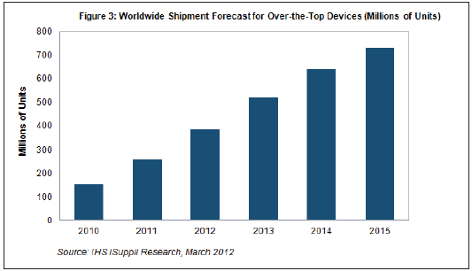 據IHS iSuppli公司的消費平臺專題報告,到2015年,支持OTT的產品出貨量預計將從2011年的2.58億個增長到7.31億個。今年支持OTT的產品出貨量預計將達到3.848億個,比2011年增長近50%,如下圖所示。2011年這個OTT市場強勁增長68%。