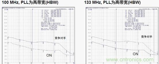 另外,多個PLL分層布置時,用戶可調節帶寬對時鐘樹進行系統優化。使用HBW(高帶寬)擴頻時鐘時用于維持擴頻特性,從而將輸入與輸出相位差減至最小;使用LBW (低帶寬)可濾除PLL帶寬內的時鐘輸入抖動。