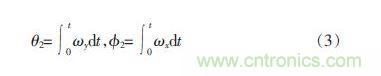 若使用陀螺儀來(lái)測(cè)量平衡車(chē)姿態(tài)角度,設(shè)陀螺儀測(cè)量載體相對(duì)慣性坐標(biāo)系的x、y、z 三軸旋轉(zhuǎn)角速度分別為ωx、ωy、 ωz。并定義0 時(shí)刻平衡車(chē)直立靜止。可得到俯仰角θ2和橫滾角φ2估計(jì)值與ωx、ωy之間的關(guān)系如式3 所示: