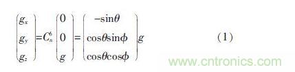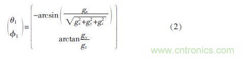 其中,Cbn為慣性坐標(biāo)系到載體坐標(biāo)系的變換矩陣;θ 為俯仰角;φ為橫滾角;g 為重力加速度; 可以通過(guò)測(cè)量重力加速度分量gx、gy、gz,計(jì)算出平衡車(chē)俯仰角θ1和橫滾角φ1估計(jì)值