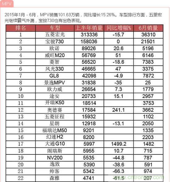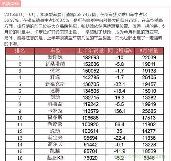 據(jù)中國(guó)汽車(chē)工業(yè)協(xié)會(huì)發(fā)布的數(shù)據(jù),2015年6月,汽車(chē)產(chǎn)銷(xiāo)量環(huán)比下降,同比繼5月后再次雙雙下降;上半年,汽車(chē)產(chǎn)銷(xiāo)增速比上年同期明顯回落。說(shuō)到汽車(chē),小編想到了由我愛(ài)方案網(wǎng)承辦的“創(chuàng)業(yè)之星”2015全球創(chuàng)客大賽成都賽場(chǎng)中的一個(gè)參賽項(xiàng)目:智能車(chē)載太陽(yáng)能轉(zhuǎn)化防護(hù)裝置,它改變?cè)扔扇斯ふ周?chē)費(fèi)時(shí)費(fèi)力方法,完全達(dá)到遙控自動(dòng)罩車(chē),屬于汽車(chē)產(chǎn)品領(lǐng)域的一項(xiàng)新技術(shù),歡迎大家到淘方案上了解詳情!下面跟著小編來(lái)看看中國(guó)汽車(chē)在2015年1月-6月的銷(xiāo)量數(shù)據(jù)!歡迎參與互動(dòng)分享!
