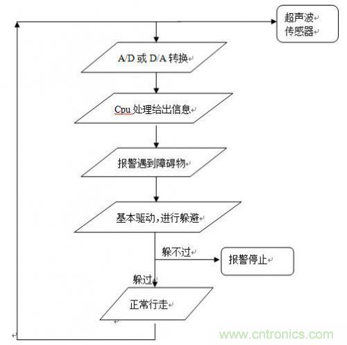 通過CMOS攝像頭采集路況信息,經(jīng)CPU處理判斷前方是否有障礙物。若無,則車?yán)^續(xù)引導(dǎo)人前行;若有障礙物,則車發(fā)聲報(bào)警。通過超聲波