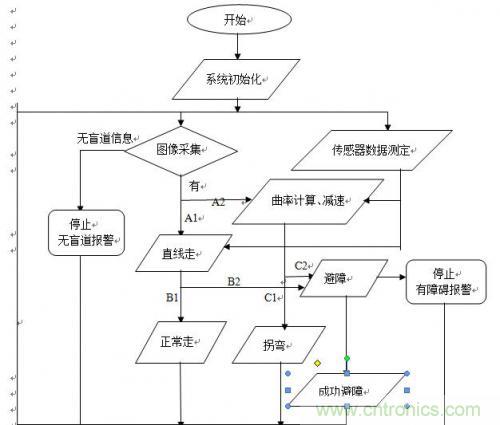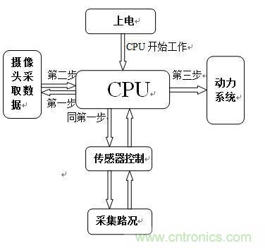 說明:上電之后,CPU開始工作。首先,CPU開始控制攝像頭和傳感器同時工作,同時采集信息,把采集回來的信息進(jìn)行分析,在CPU內(nèi)部進(jìn)行A/D或D/A轉(zhuǎn)換,然后將轉(zhuǎn)換后的信息傳遞給舵機(jī),使舵機(jī)在CPU的控制下進(jìn)行工作。