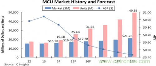 盡管將來的ASP還會繼續(xù)下滑,IC Insights預(yù)測明年的微控制器收會增長7%至177億美元,全球的出貨量會增長25%至316億顆。