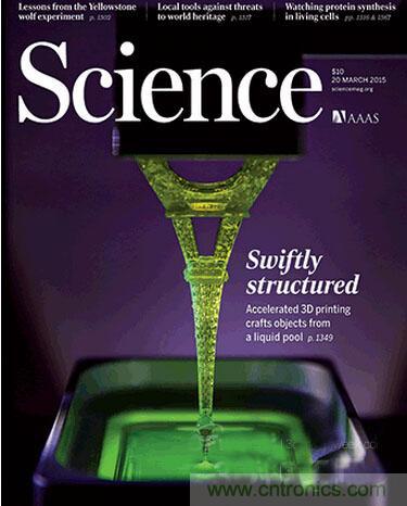 這些神奇的動圖都出自最近發表在《科學》(Science)上的一篇有關3D打印技術的研究論文。這種新技術顯然也征服了期刊的編輯,在期刊封面上都出現了這個從液體中打印出來的“倒立鐵塔”的身影。那么,這種液體3D打印技術究竟有什么過人之處?球和塔又是怎么從液體里“拉”出來的呢?