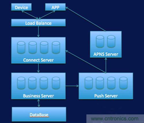 看一下最簡單的IM架構,這里面要保持長連接,接下來做一些業務處理,下面是存儲,如果App要去控制Device的時候,發到業務層處理完了之后,這里面有一個推送的,可以找到Device到底連了哪一臺機,然后再把數據推送過來。如果Device自己的狀態發生變化,它的數據要推送給APP,基本上是這樣的工作流。如果App是黑莓等設備的,我們可能要專門推送到APNS里面來。