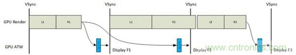 Oculus在博客里對ATW做了詳細的解釋。如上圖所示,GPU給左右眼的畫面分別進行渲染,然后在畫面顯示出來之前插入一個ATW的處理過程。在左邊這幀的處理中,畫面渲染及時完成,此時直接顯示就行了;中間的第二幀渲染未能及時完成,此時如果什么都不做就會出現畫面抖動,而有了ATW的話,它會將前面一幀調用出來重新顯示,同時加上頭盔運動變化,從而保持幀率。
