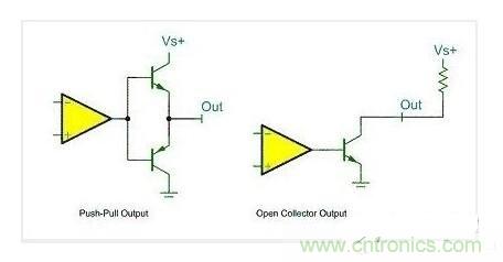 關于推挽輸出和開漏輸出,最后用一幅最簡單的圖形來概括:該圖中左邊的便是推挽輸出模式,其中比較器輸出高電平時下面的PNP三極管截止,而上面NPN三極管導通,輸出電平VS+;當比較器輸出低電平時則恰恰相反,PNP三極管導通,輸出和地相連,為低電平。右邊的則可以理解為開漏輸出形式,需要接上拉。