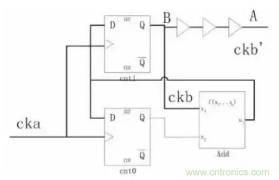 為了方便討論,時(shí)鐘樹插入以后,假設(shè)A與B之間有1個(gè)ckaCycle的skew;從圖3可以看到如果采用A點(diǎn)作加法器的輸入時(shí)產(chǎn)生的波形是ckb’,采用B點(diǎn)作為輸入時(shí)的波形是ckb,顯然,從例1的代碼來看,ckb才是正確的。因此必須注意到,如果時(shí)鐘當(dāng)作普通的信號(hào)使用時(shí)可能帶來的問題,這類問題并沒有一個(gè)通用的解決辦法。在這個(gè)例子中,不采用時(shí)鐘樹上的信號(hào)才是正確的,但是在另外一些應(yīng)用中,就必須采用時(shí)鐘樹上的信號(hào)。比如,時(shí)鐘是CK的兩個(gè)觸發(fā)器中鎖存的數(shù)據(jù)再由CK的高電平和低電平選擇輸出,那么,這個(gè)時(shí)候就需要作為選擇信號(hào)的CK從時(shí)鐘樹上拉過來。因此,如果設(shè)計(jì)中用到了時(shí)鐘信號(hào)作為普通信號(hào)的情況,在后端設(shè)計(jì)時(shí)就必須特殊處理。