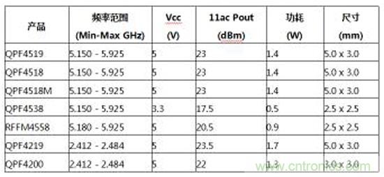 新的Qorvo FEM支持最新一代802.11ac和Wave 2 1024QAM家居Wi-Fi產(chǎn)品,功耗比現(xiàn)今市面同類產(chǎn)品低2瓦特。這足以使一些Wi-Fi聯(lián)網(wǎng)設(shè)備的風(fēng)扇變得不必要,進(jìn)一步降低功耗,減小尺寸。5 GHz FEM現(xiàn)在提供樣片;2.4 GHz型號(hào)將在2017年一季度推出。下表總結(jié)了新Qorvo Wi-Fi FEM系列的規(guī)格。