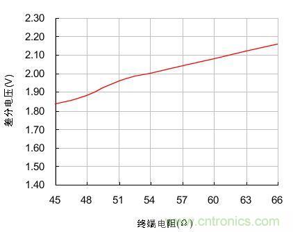 在負載電阻由45Ω不斷增大到66Ω時,節點的輸出差分電壓也隨著由1.84V增大到2.16V,兩者近似線性關系。為了使發送節點的輸出差分電壓不至于過低,實際組網時負載電阻應在圖 1測試的范圍內波動。我們分析RL的組成有3個:終端電阻、總線節點的差分輸入電阻、總線本身的有效電阻。