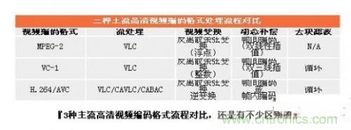 我們下面來看看主流的3種編碼格式,包括Mpeg2、VC-1、H.264的解碼流程對比(見下圖)。可以看出,幾種編碼格式還是有不少區(qū)別的,這也是造成幾種編碼格式要求不同的原因,H.264編碼格式最為復雜,因此系統(tǒng)要求最高,VC-1略有降低,但是也比Mpeg2高得多。