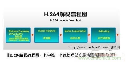 那么究竟高清編碼的步驟有哪些,哪些又是負載最高的部分呢?以H.264視頻舉例而言,分為四個主要部分(見下圖)。圖中的四個方塊基本就是H.264解碼的四個最主要步驟,也是資源消耗的主要四個部分,其中又以第一步的“CAVLC/CABAC解碼”最為消耗運算資源,這方面遠高于其他三步(簡單的說,CAVLC/CABAC是H.264編碼規(guī)范中兩種不同的算法,際俏了提高壓縮比,其中CABAC比CAVLC壓縮率更高,但解碼時自然也要求更高)。