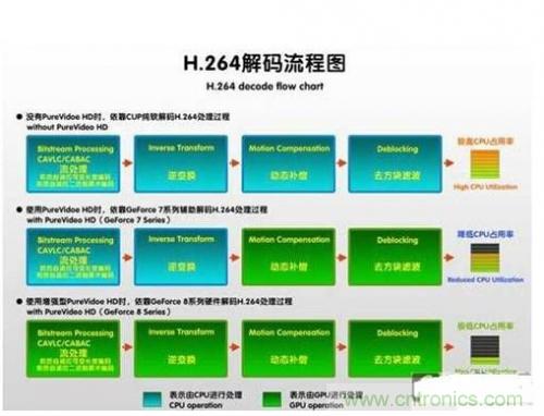 通過具有H.264硬件解碼引擎的顯卡,就可以完成H.264編碼的全部4個處理步驟(圖解第三行),也就是實現(xiàn)全程解碼,這就是它們能讓H.264高清視頻播放的CPU占用率大幅度下降的根本原因。既然顯卡完成了所有的高清解碼處理,那么CPU自然就空閑了。而我們所謂的部分解碼,就是CPU仍然承擔一定的處理任務(wù),因此占用率仍然要高出不少。