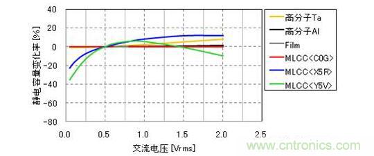 圖3:各種電容器的靜電容量變化率-交流電壓特性(示例)