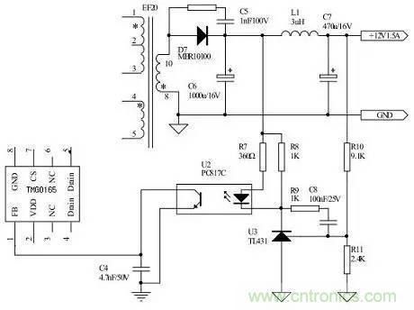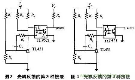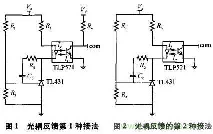 本研究將詳細分析光耦工作原理,并針對光耦反饋的幾種典型接法加以對比研究。1、常見的幾種連接方式及其工作原理常用于反饋的光耦型號有TLP521、PC817等。這里以TLP521為例,介紹這類光耦的特性。TLP521的原邊相當于一個發光二極管,原邊電流If越大,光強越強,副邊三極管的電流Ic越大。副邊三極管電流Ic與原邊二極管電流If的比值稱為光耦的電流放大系數,該系數隨溫度變化而變化,且受溫度影響較大。作反饋用的光耦正是利用“原邊電流變化將導致副邊電流變化”來實現反饋,因此在環境溫度變化劇烈的場合,由于放大系數的溫漂比較大,應盡量不通過光耦實現反饋。此外,使用這類光耦必須注意設計外圍參數,使其工作在比較寬的線性帶內,否則電路對運行參數的敏感度太強,不利于電路的穩定工作。通常選擇TL431結合TLP521進行反饋。這時,TL431的工作原理相當于一個內部基準為2.5V的電壓誤差放大器,所以在其1腳與3腳之間,要接補償網絡。TL431是三端可編程并聯穩壓二極管開關電源中光耦的作用