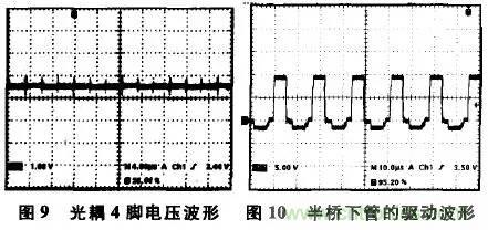 根據上述分析,以下針對不同的典型接法,對比其特性以及適用范圍。本研究以實際的隔離半橋輔助電源及反激式電源為例說明。第1種接法中,接到電壓誤差放大器輸出端的電壓是外部電壓經電阻R4降壓之后得到,不受電壓誤差放大器電流輸出能力影響,光耦的工作點選取可以通過其外接電阻隨意調節。按照前面的分析,令電流If的靜態工作點值大約為10mA,對應的光耦工作溫度在0~100℃變化,值在20~15mA之間。一般PWM芯片的三角波幅值大小不超過3V,由此選定電阻R4的大小為670Ω,并同時確定TL431的3腳電壓的靜態工作點值為12V,那么可以選定電阻R3的值為560Ω。電阻R1與R2的值容易選取,這里取為27k與4.7k。電阻R5與電容C1為PI補償,這里取為3k與10nF。實驗中,半橋輔助電源輸出負載為控制板上的各類控制芯片,加上多路輸出中各路的死負載,最后的實際功率大約為30w。實際測得的光耦4腳電壓(此電壓與芯片三角波相比較,從而決定驅動占空比)波形,如圖9所示。對應的驅動信號波形,如圖10所示。圖10的驅動波形有負電壓部分,是由于上、下管的驅動繞在一個驅動磁環上的緣故。可以看出,驅動信號的占空比比較大,大約為0.7。