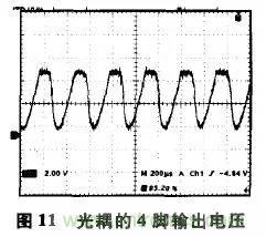 同樣,對于上面的半橋輔助電源電路,用接法2代替接法1,閉環不穩定,用示波器觀察光耦4腳電壓波形,有明顯的振蕩。光耦的4腳輸出電壓(對應于UC3525的誤差放大器輸出腳電壓),波形如圖11所示,可發現明顯的振蕩。這是由于這個半橋電源穩態占空比比較大,按接法2則光耦增益大,系統不穩定而出現振蕩。