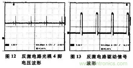 以下是另外一個實驗反激電路,工作在斷續模式,實際測得其光耦4腳電壓波形,如圖12所示。實際測得的驅動信號波形,如圖13所示,占空比約為0.2。