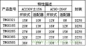 TMG0321/TMG0165/TMG0265/TMG0365芯片是一款高集成度、高性能的PWM+MOSFET管二合一的電流型離線式開關電源控制器。適用于充電器、電源適配器、LED驅動電源等各類小功率的開關電源。采用DIP8封裝,無需加散熱器可輸出0~36W的功率(加散熱可以做到更大)。電路結構簡單,成本低。具有完善的保護功能,包括過壓、欠壓、過溫、過載及短路等保護。固定振蕩頻率及抖頻功能,可以降低EMI。待機功率低,在待機時進入跳周期模式,符合“能源之星”等待機功耗標準要求。