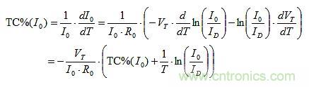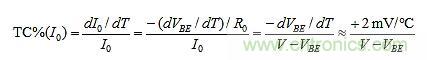 TC%(I0) = TC%(IE)的設定可以建構如下。R0上的唯一變化來自VBE。因此,由T引起的I0的分數變化是: