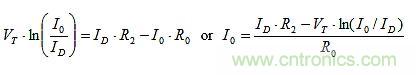 如果假定一個類似的BJT b-e結用作二極管,其基極連接到集電極,那么結點匹配就好得多(雖然不如相鄰集成BJT好),并允許α ≅ 1,然后在BJT輸入回路周圍施加基爾霍夫電壓定律(兩個BJT結的IS被消除):