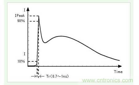 AEC-Q200-002HBM的ESD測試電路及放電電流波形如圖1、圖2所示。