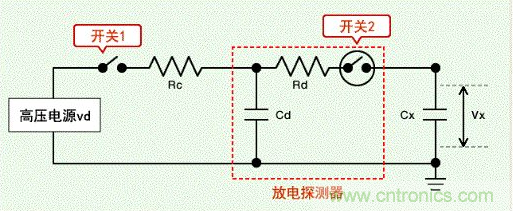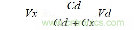電源電壓(Vd)及充電用電容器的靜電容量(Cd)恒定時,測試對象電容器的靜電容量(Cx)越大,測試對象電容器兩端產生的電壓(Vx)越小。