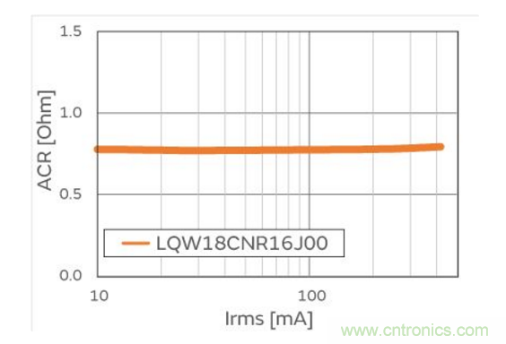 由于電感器的電流值發生變化,電感值也會發生變化。如圖2所示,LQW18CN系列對于AC電流的電感值依存性非常小。因此,即使NFC電路流通的AC電流變大,特性也不會發生很大變化。此外,如圖3 所示,即使是大電流也能保持低ACR。