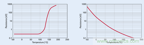 在超出某一特定溫度時(shí),正溫度系數(shù) (PTC) 熱敏電阻(左圖)的電阻出現(xiàn)急劇升高,故而適合用作溫度限值傳感器。而負(fù)溫度系數(shù) (NTC) 熱敏電阻的電阻則呈線性關(guān)系,故而適用于溫度測(cè)量。