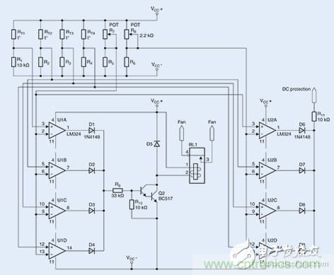 2個(gè)開關(guān)閾值的參考值將通過2個(gè)微調(diào)器,即R7和R8(分別為2.2 k?)進(jìn)行設(shè)置。如上所述,兩個(gè)微調(diào)器將分別產(chǎn)生900?或550?的電阻。至于8個(gè)所需的比較器(U1A-U1D以及U2A-U2D),則采用經(jīng)濟(jì)型LM324放大器。在滿負(fù)荷跳線模式下進(jìn)行的一個(gè)持續(xù)數(shù)小時(shí)的測(cè)試表明,風(fēng)扇能夠在85℃時(shí)可靠地進(jìn)行開啟。由于系統(tǒng)具有相對(duì)較低的熱量期限,故而無需采用常用的滯回比較器電路。