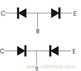 2.發(fā)射結(jié)和集電結(jié)都是屬于pn結(jié),具備pn結(jié)的特性,因此其結(jié)構(gòu)相當(dāng)于一個(gè)極(陰極和陰極或者陽極和陽極)并聯(lián)在一起的兩個(gè)二極管,這個(gè)公共的電極就是基極,而另外兩個(gè)極就是集電極和發(fā)射極;見圖二,上面的對應(yīng)的是npn型三極管,下面的對應(yīng)的是pnp型三極管;