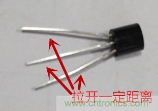 1.首先將三極管的三個(gè)管腳前后或者左右拉開一定距離,以便于測量;這樣可以避免表筆短路,如下圖三所示: