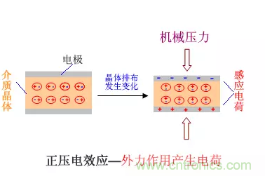 對具有壓電特性的介質材料施加機械壓力,介質晶體會發生結構重組排布,材料表面會感應出電荷,產生電位差。
