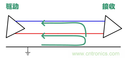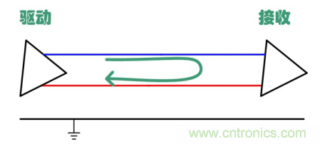 先介紹共模干擾,圖 1、圖 2分別給出了差模和共模干擾及其傳輸路徑。圖中的驅動器及接收器為差分信號傳輸,類似CAN總線。差模干擾產生于兩條傳輸線之間,共模干擾則在兩條線中同時產生,其電勢是以地為參考。