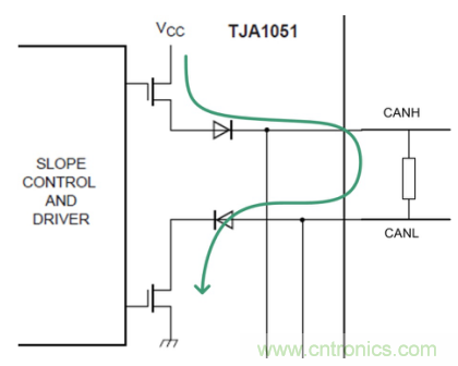 CAN收發器內部CANH、CANL分別為開源,開漏輸出形式,驅動電路如圖 3所示。這種方式可以使總線輕松實現顯性電平的驅動,而隱性電平則通過終端電阻放電來實現。