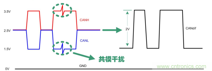 總線固有的差分傳輸形式使得CAN對于共模干擾有很好的抑制能力,如圖 4所示,通過CANH、CANL相減可很好地消除來自外部的共模干擾,但CANH、CANL并非理想對稱,快速上升的跳變沿,這些均會帶來EMC問題。我們通過示波器看總線波形很完美,測試靜電,EFT,浪涌,傳導騷擾抗擾均無異常。但測試傳導發射,則不能滿足限值要求,看起來很正常的總線實際卻向外在發送傳導干擾。