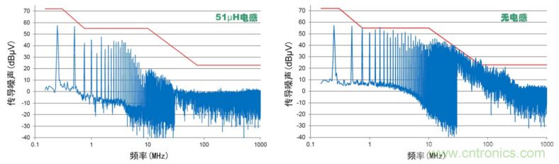 對于CAN接口的EMC問題,除了選用更好性能,符號要求的CAN收發芯片,另一種簡單的方法就是對CAN接口增加外圍,共模電感是一種很好的選擇。在現有汽車電子CISPR 25標準中,對傳導騷擾限值有很嚴格要求。許多CAN收發器均會超過限值。如圖 5分別為按照車規限制測試增加和不加共模電感的CAN接口傳導騷擾,共模電感值為51μH,可以看到在各個頻段下對噪聲改善較為明顯,測試結果仍有很大裕量。