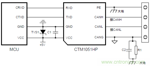 ZLG致遠電子基于多年的總線防護設計積累推出了高防護等級隔離模塊——CTM1051(A)HP系列。該系列符合國際ISO11898-2標準,靜電防護等級可達接觸±8kV,空氣放電±15kV,浪涌防護可達±4kV隔離CAN解決方案,具體如下圖7所示,能夠適用于各種惡劣的工業現場環境。應用簡便,即插即用,應用原理圖如下圖8所示。