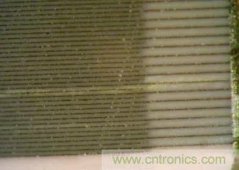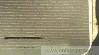 熱沖擊主要發生在波峰焊時,溫度急劇變化,導致電容內部電極間出現裂縫,一般需要通過測量發現,研磨后觀察,通常是較小的裂縫,需要借助放大鏡確認,少數情況下會出現肉眼可見的裂縫。