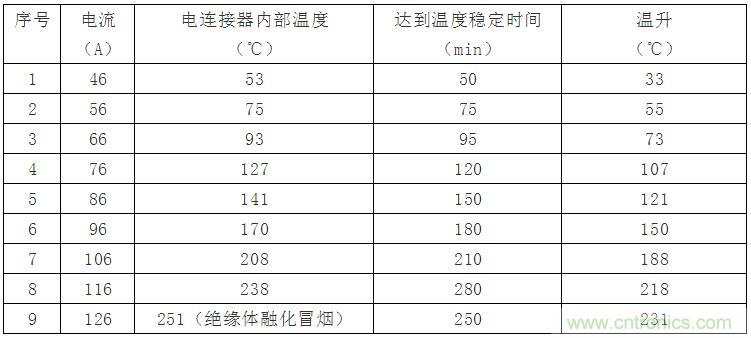 取8芯電連接器1套,接觸體壓接16mm2導線,送入后將所有孔位串聯,通以額定電流,當電連接器內部溫度穩定后,逐步增加電流值,直至溫度超過電連接器承受能力。試驗結果見表2: