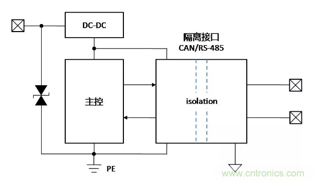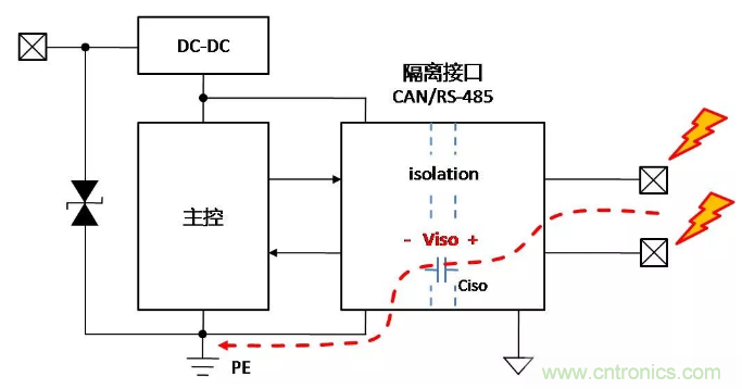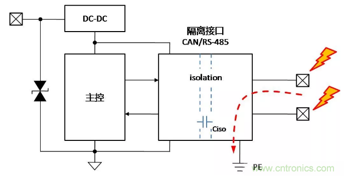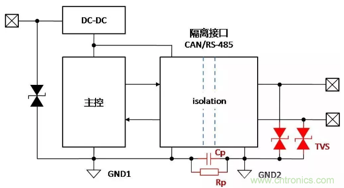 總線增加隔離固然可以保證總線穩定可靠地通信,但是帶隔離通信接口的設備,在復雜的環境或安裝狀態下,接口會表現出完全不同的ESD特性,了解ESD對接口的影響機理,才能有針對性地增加保護器件,提升隔離接口的ESD能力。下面以帶有隔離CAN或RS-485通信接口為例,對常見的設備狀態下,ESD的作用機理進行分析,并提出相應的改善措施。