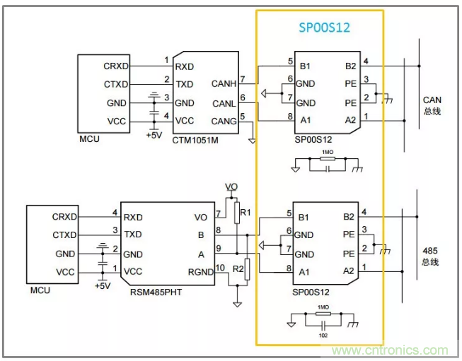 前面只是對ESD的作用機理進行了分析,但隨著工業產品對通信接口的EMC等級要求越來越高。許多應用要求滿足IEC61000-4-2靜電放電4級,IEC61000-4-5浪涌抗擾4級要求。一般的收發器ESD、浪涌的防護等級均比較低,如CTM1051M隔離CAN收發器的隔離耐壓為2500VDC,裸機情況下,ESD、浪涌等級均較低。所以有必要增加外圍電路,提高通信端口的EMC等級。
