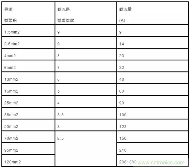 2.5mm’及以下的各種截面鋁芯絕緣線,其載流量約為截面數的9倍。如2.5mm’導線,載流量為2.5×9=22.5(A)。從4mm’及以上導線的載流量和截面數的倍數關系是順著線號往上排,倍數逐次減l,即4×8、6×7、10×6、16×5、25×4。
