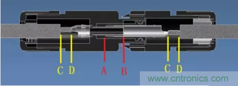 對所有的樣品進行初步外觀分析后發現,連接器燒毀的部位主要存在于連接器的中間部分(即A-B段,記為Rco)及兩端壓接部分(即C-D段,記為Rcr)(見圖4)。