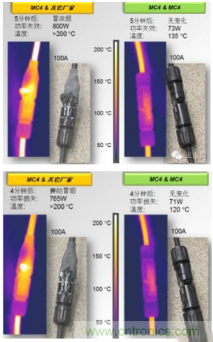而與之形成鮮明對比的是MC4自身公母頭插合后的測試結果:除了溫度有初始的90℃升高到135℃及功率損失由69W升高到73W外,外觀并無明顯的變化。