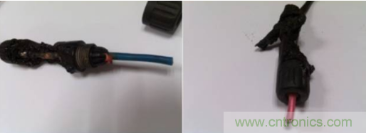 而在失效的樣品中就有兩個是用了不同的電纜,且外徑相差懸殊。圖11 中的左側圖連接器一側用的是光伏電纜(黑色),外徑為6mm,而另一側則是用的  普通線纜(藍色),外徑僅為4mm。將藍色電纜端的螺帽擰開后發現可能由于密封不夠竟采用了紅色塑料片填充。在該種情況下連接器是很難保證其密封性,因此,在戶外應用時有可能會進水進塵,從而破壞絕緣性能,進而引發火災。