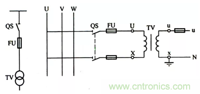 單相電壓互感器一次側端子為U、X,二次側為u、x;三相電壓互感器一次側端子為U、V、W,二次側為u、ⅴ、w、0。電壓互感器具有首端標志u的端子應和儀表的相線端連接,末端x接地并與儀表中性線端連接。